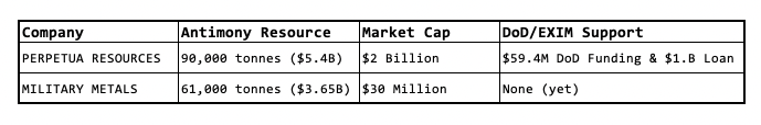 Perpetua Resources, with a historical resource of 90,000 tonnes of antimony, has surged to a $2 billion market cap. Military Metals, with 61,000 tonnes at Trojarova alone and a diversified asset base, trades at just $28 million.