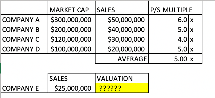 Now, we know that company E is doing $25M in sales. Thus, we take the average P/S multiple of the peer group (5.0x) and multiply by the sales of company E ($25M).
