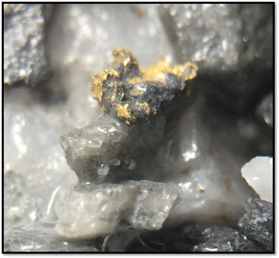 Following the announcement of this high-grade gold intercept, the alteration halo outside of the heavily mineralized zone was assayed. The complete assay of the intercept, from 95m, is now 8m at 106 g/t Gold including 5m at 166 g/t Gold including 2m at 413 g/t Gold including 1m at 468 g/t Gold and 1m at 358 g/t Gold.