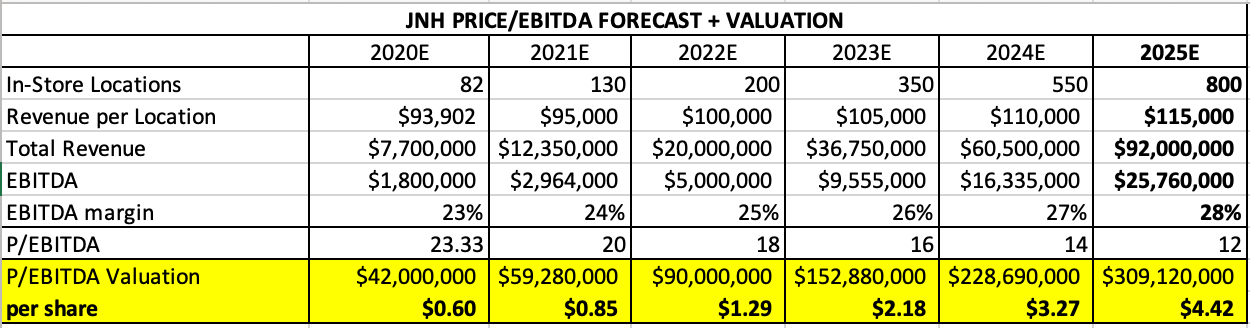We have built a quick revenue/EBITDA forecast and valuation model for JNH. Currently, the company is operating 82 total stores with $7.7million in annual revenue, so ~$93k per location.