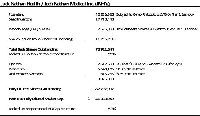 Jack Nathan went public through a capital pool shell, Woodbridge Ventures Inc. PI Financial and Regent Capital Partners (with Canaccord and Eight Capital) completed a $5.6m oversubscribed financing for JNH in July that involved the issuance of Units at $0.50 each with a half warrant exercisable at $0.75 for two years (with an acceleration provision at $1.00). The CPC used for the Qualifying Transaction, Woodbridge Ventures, was rolled back 1:3 so the $0.10 IPO shares now have a cost base of $0.30. The company has no outstanding debt. Below is an updated cap table for Jack Nathan Health.