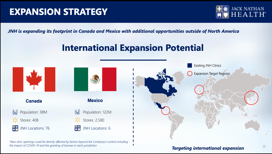 Strategic 14 year relationship with Walmart; Co-locating at Walmart locations – JNM currently operates 76 clinics in Canada and 6 in Mexico, with many more under development, servicing 1.5 million+ patient visits annually