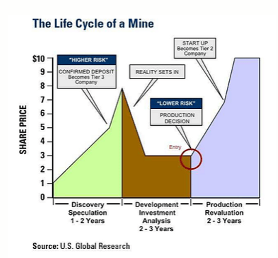 A brief comparison of the Arizona Mining stock chart to the ‘Life Cycle of a Mine’ chart below should help you to gain a better understanding of the recent activity in the stock price.
