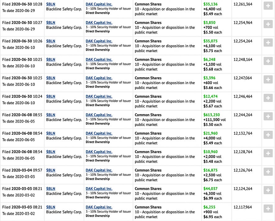 This August, Blackline announced another financing at $2.20 and DAK ended up taking down $12 million of it. A pretty big chunk. On top of that, he has also been actively buying on the open market, all the way up to $7.00, as shown in the SEDI filings.