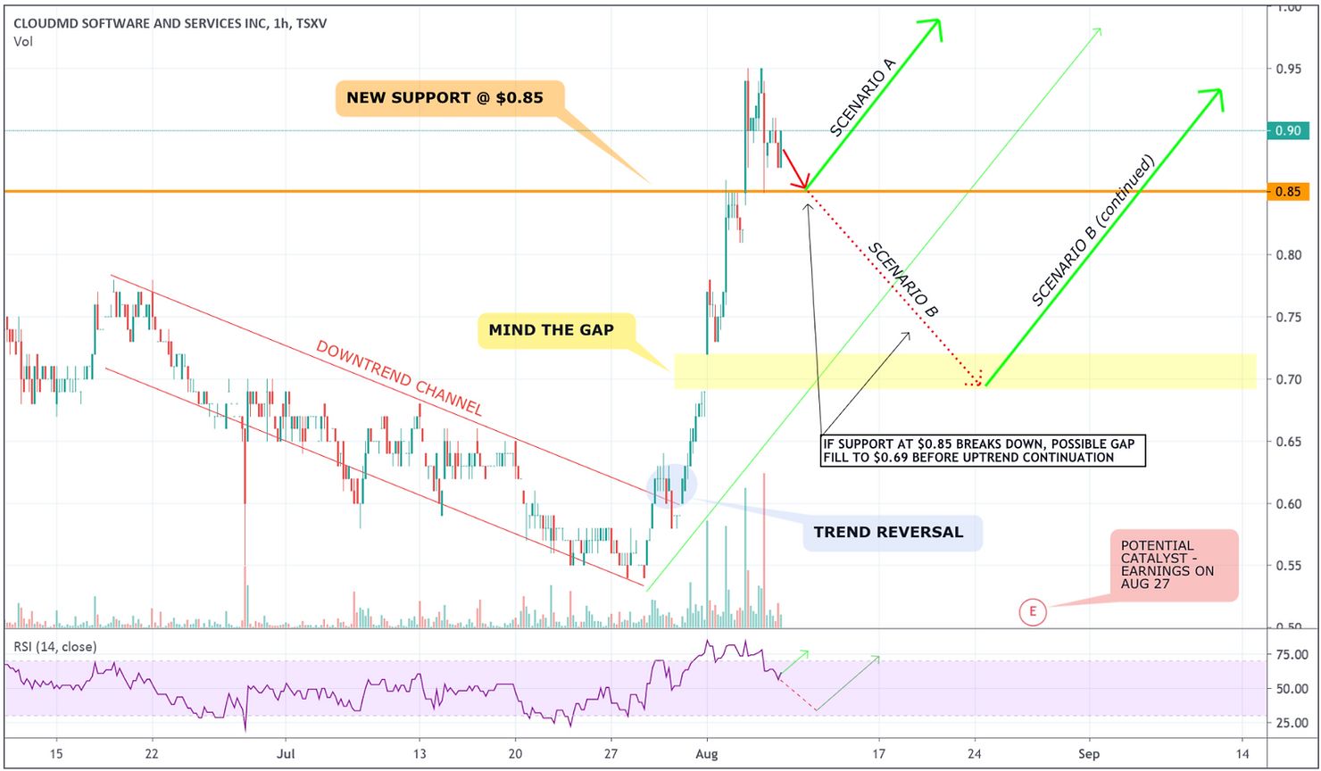 Now let’s take a look at the chart to see if we can try to predict where the stock might be headed next. Since we have a medium-term time horizon on CloudMD, we will use a 3-month chart.