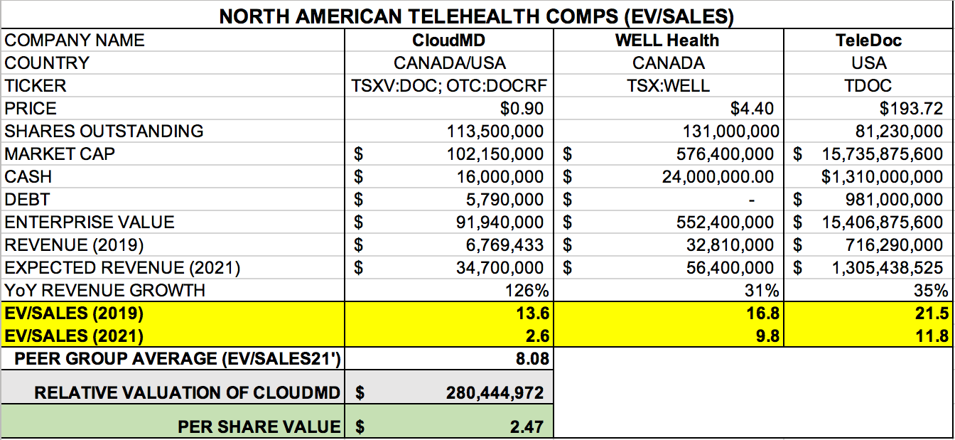 At present, CloudMD is being too heavily undervalued by the market based on a comparable analysis using EV/SALES(’21) as the primary metric.