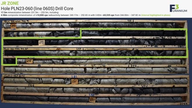 This hole intersected 3.82m of off-scale (>65,535 cps) radioactivity. The assay analysis for PLN23-060 returned one continuous 14.5m interval averaging 9.4% U3O8 including an ultra-high-grade 5.0m interval averaging 26.7% U3O8, which further includes a 2.5m interval which assayed 45.6% U3O8. These are incredibly high uranium grades and are further evidence of a large, high-grade uranium deposit on F3’s PLN property.