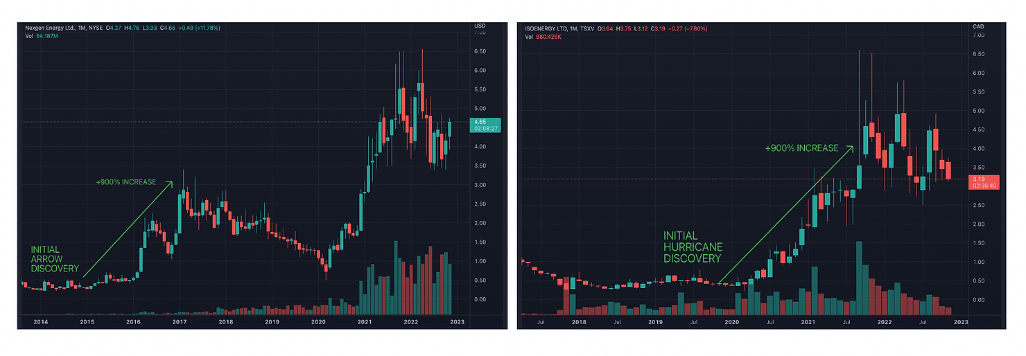When NexGen made their initial discovery, the stock ran from $0.30 to $3.00 over a 1-2 year time span. The same thing happened to ISOenergy’s stock when they made their Hurricane discovery, from $0.40 to $4.00 in less than two years.