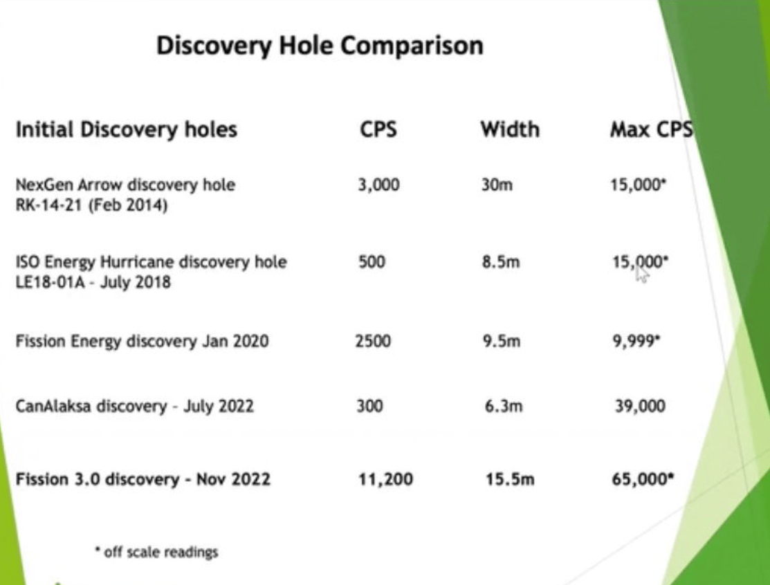A comparison of F3’s discovery hole with others in the region reveals its significantly higher CPS count reading, even surpassing NexGen Energy’s Arrow discovery.