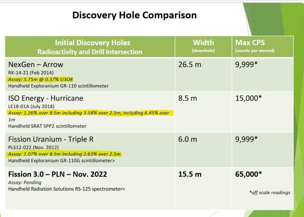 This is significantly better than both NexGen and ISO’s discovery holes in every aspect. Not only are the grades much higher than the other two discoveries, but the width is as well. While grade is important, size is equally as important. To prove up a viable uranium deposit, you need to have both grade and size, and it appears that FUU has both.
