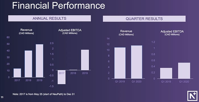 There are also opportunities for Neupath to grow which are line with the digital trends in healthcare. Grant Connelly, CEO of Neupath, recently commented, “Our ability to shift patients, physicians, and staff to other clinics in our network, combined with our success in converting 10% of our total visits to virtual visits, allowed us to continue to provide essential care to chronic pain patients in Ontario. We saw an increase in patient demand for treatments in late April that allowed us to re-open the clinics that we closed in March and we saw improved business performance in May and June.” It is clear that the management team at Neupath understands the need for telehealth and virtual care in the COVID-era and they have reacted accordingly. Given that the company is already well positioned in the clinic market, I would not be surprised to see them start to leverage the power of technology even further in order to start increasing the profitability and efficiency of their assets. Currently, Neupath’s main brand [CPM] has geographic coverage in 9 cities from Southwestern to Eastern Ontario. Given that the company is doing $50 million in revenues and is only operating in one province, there is significant expansion potential in other provinces.