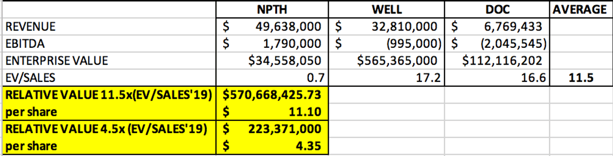 As you can see, NPTH is currently trading at a multiple of 0.7x EV/SALES’19. To put this into perspective, WELL is currently trading for 17.2x EV/SALES’19 and another player in the space, CloudMd, is currently trading for 16.6x EV/SALES’19. The peer group average is 11.5X. If you were to take the industry average EV/SALES’19 of 11.5x and multiply it by NPTH’s revenues, you would end up with a valuation of around $570 million, which is equivalent to $11.10 per share.
