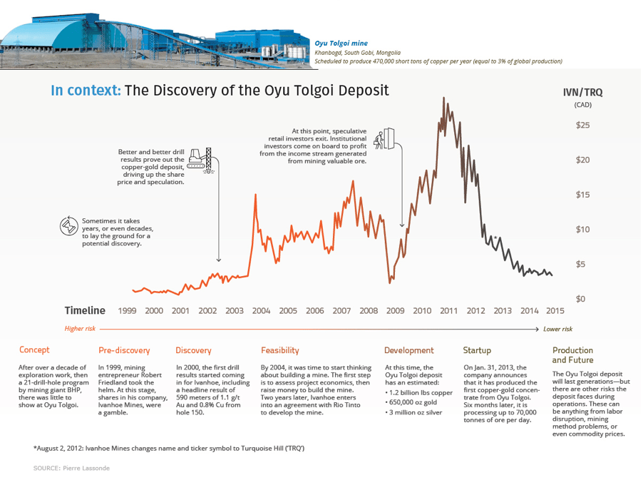 Initial exploration work near the Oyu Tolgoi site took place in the 1980s. However, it wasn’t until 1996 that Australian miner BHP conducted further exploration activities.After conducting 21 drill holes, BHP lost interest in the project and opted to option the property to mining entrepreneur Robert Friedland and his company Ivanhoe Mines. At this stage in 1999, investing in Ivanhoe shares was considered speculative.