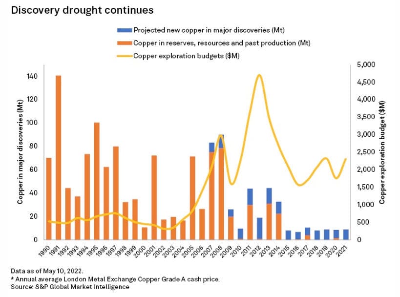 Despite elevated copper exploration budgets over the past several years, it has not led to a meaningful increase in the number of recent major discoveries.