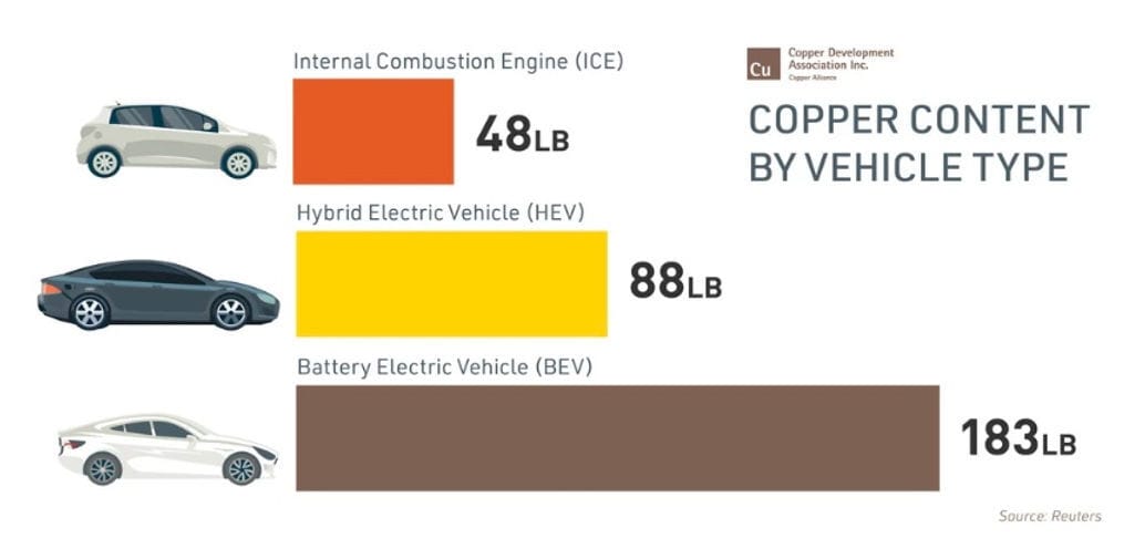 A single battery electric vehicle requires 183 lbs of copper, compared with an ICE vehicle which requires just 48 lbs of copper to produce.