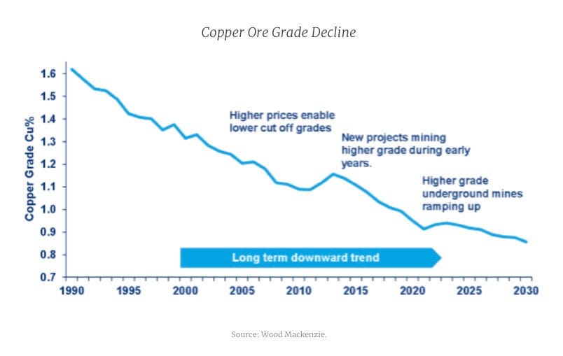 Another significant challenge facing the future supply of copper is declining ore grades.