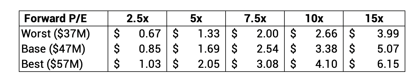 So, I took a reasonable range of P/E multiples (2.5-15x) based on other similar companies as well as the industry average. The relative valuation table is shown below.