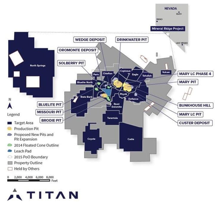 Below is a map highlighting areas of previous mining, planned mining and exploration target areas at Mineral Ridge.