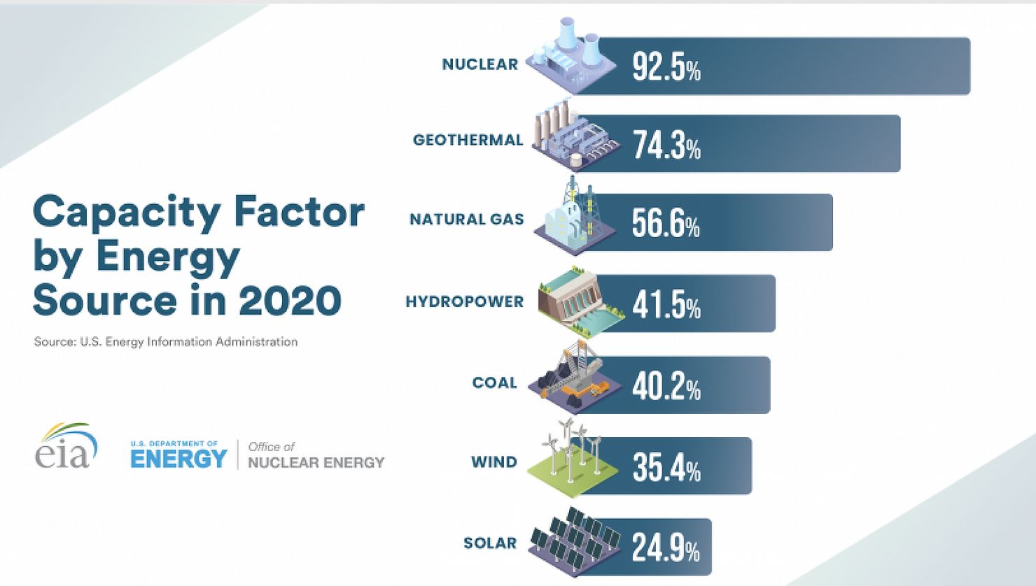 As you can see, nuclear energy has by far the highest capacity factor of any other energy source. Nuclear power plants are producing maximum power more than 92% of the time during the year, which is nearly 2 times more than natural gas and coal units, and almost 3 times more than wind and solar plants.